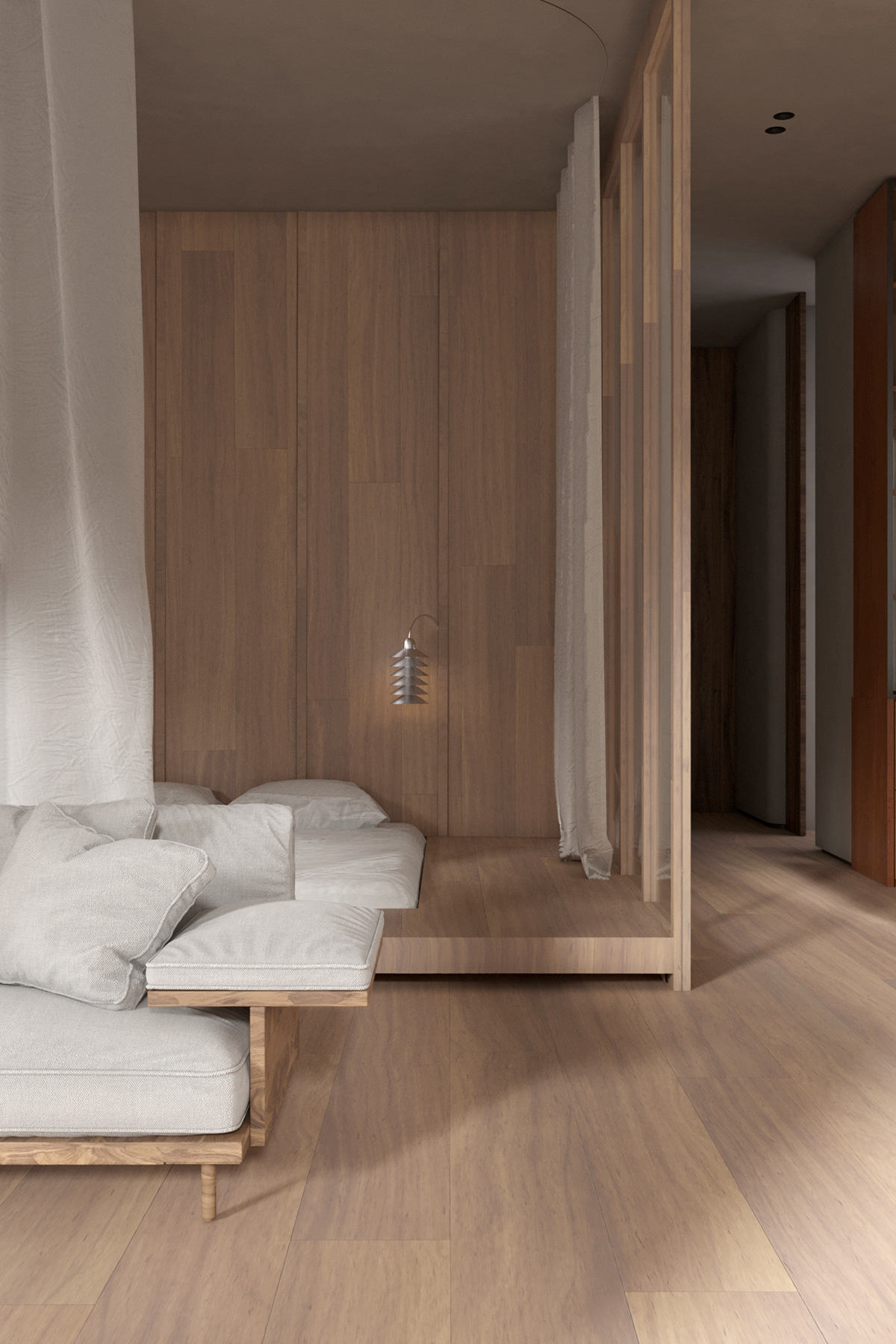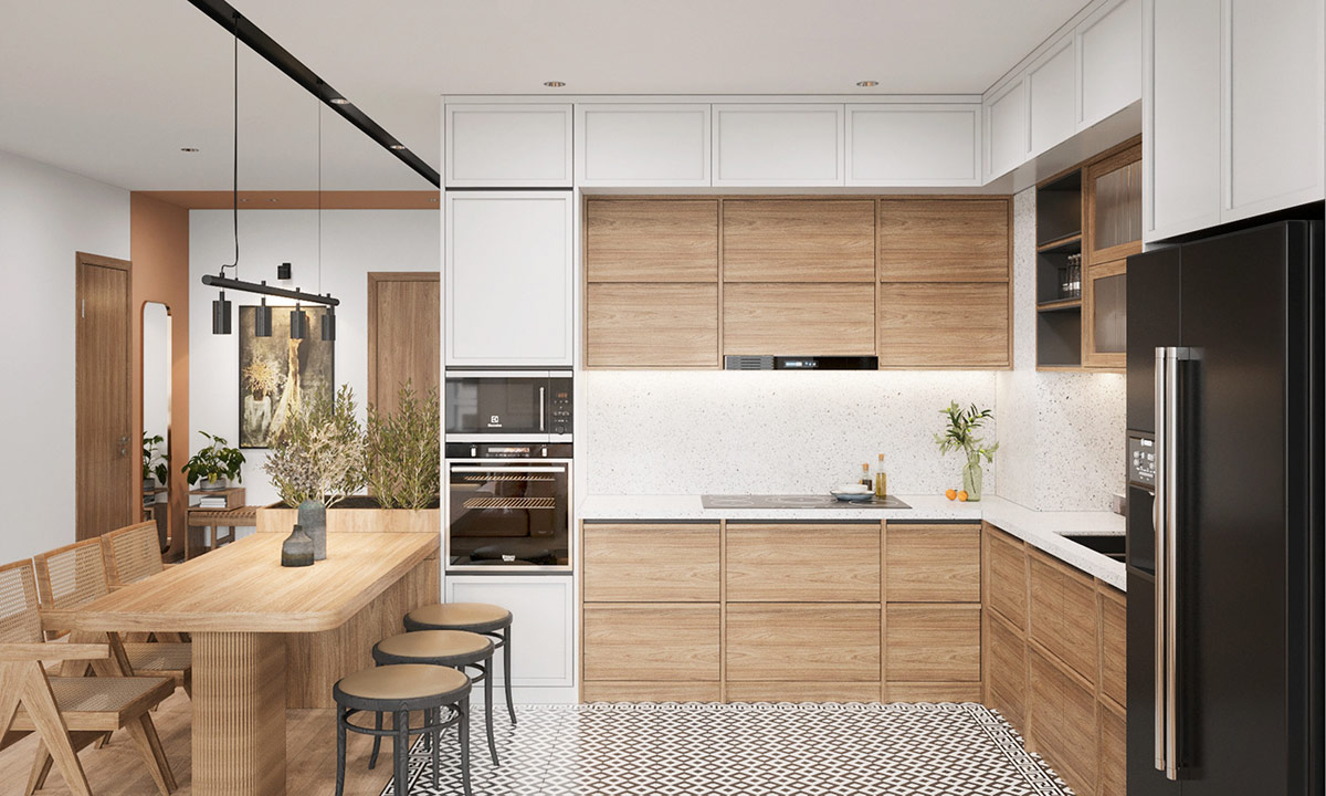 In front of the sofa, an Ottoman coffee table is joined with two wooden and glass equivalents to make a long arrangement in the center of the living room. The wood-paneled TV wall is actually a sturdy structural wall that has become a determining factor in deciding the home layout. While the wooden upholstery warms up the light decor of the living room, soft mood lighting evokes an atmospheric, comfortable atmosphere.