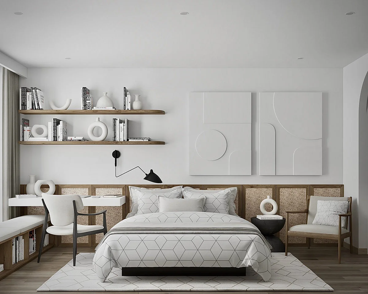 These three modern home interiors are inspired by fresh Scandinavian style decorative elements while highlighting an elegant Asian distinction. In fashion, a graceful arch motif unites the aesthetics of the Japandi interior apartments, along with a warm natural wood tone and a clear white color palette. Displayed by Elemental Design, This group of inspirational homes is designed as contemporary family units with functional open plan living spaces. Practical storage ideas use small hallways and home entrances, bedrooms are multifunctional with clothing areas and home workshops. The children’s rooms are beautiful, colorful and compact, with fun ideas for children’s closets, built-in bookcases, tailored bed designs, children’s desks and adorable decor.