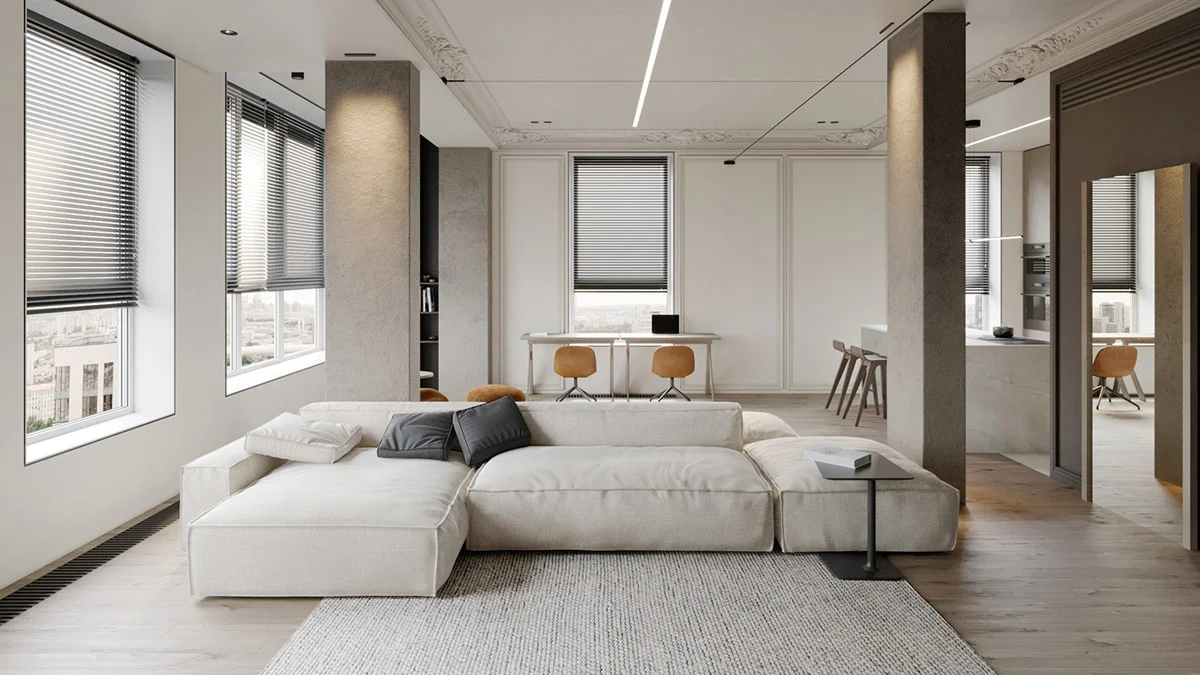 This 230 square meter apartment in Moscow, Russia, has an airy light gray apartment with high white ceilings. Decorative crown fusion trims the edges of the room, absorbing an aspect of classic refinement, while the sectional sofa and accompanying furniture are strictly modern in simplified silhouettes.
