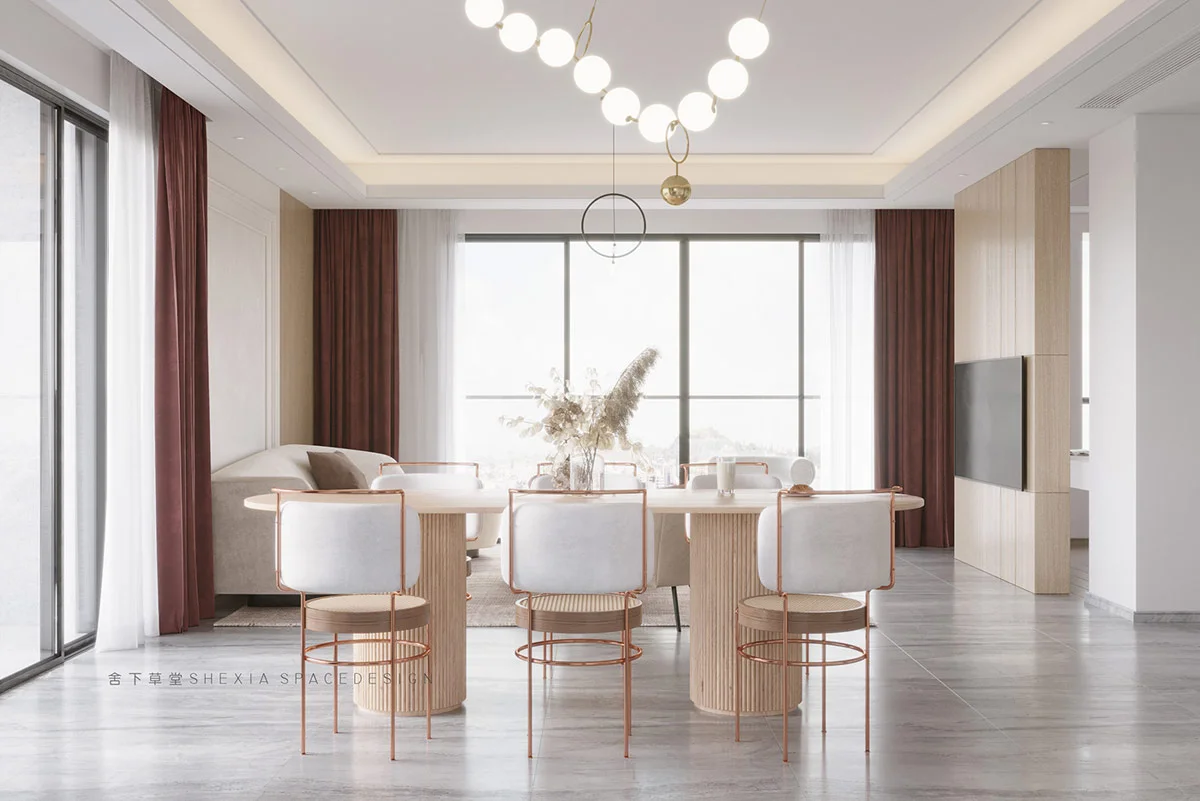 Displayed by Ivan Petechel and Kut Victor, our second curved home design is a bright and welcoming space. A curved sofa surrounds a round rectangular coffee table in the living room, while a running dining table curves the furniture behind.