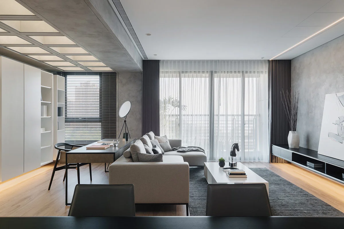 Measuring 115 square meters (1245 square feet), this apartment interior is located in a tall building that faces the Tamsui River in Zhuwei District of New Taipei City. Rainy days at the end of winter previously evoked a sad atmosphere in this place, but now every day is overshadowed by the light of a false skylight that extends over the study area and the walkway that leads to the kitchen.