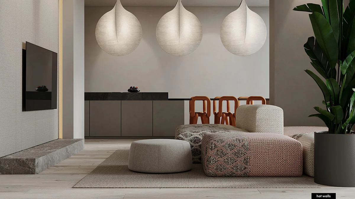 As we enter the open layout of our second prominent home interior, we come across a soothing plan of a white and wooden living room. An entire wall of white kitchen cabinets falls quietly into the background. A kitchen island floats freely in the layout where it defines the edge of the dining room. A modern sofa marks the living room.