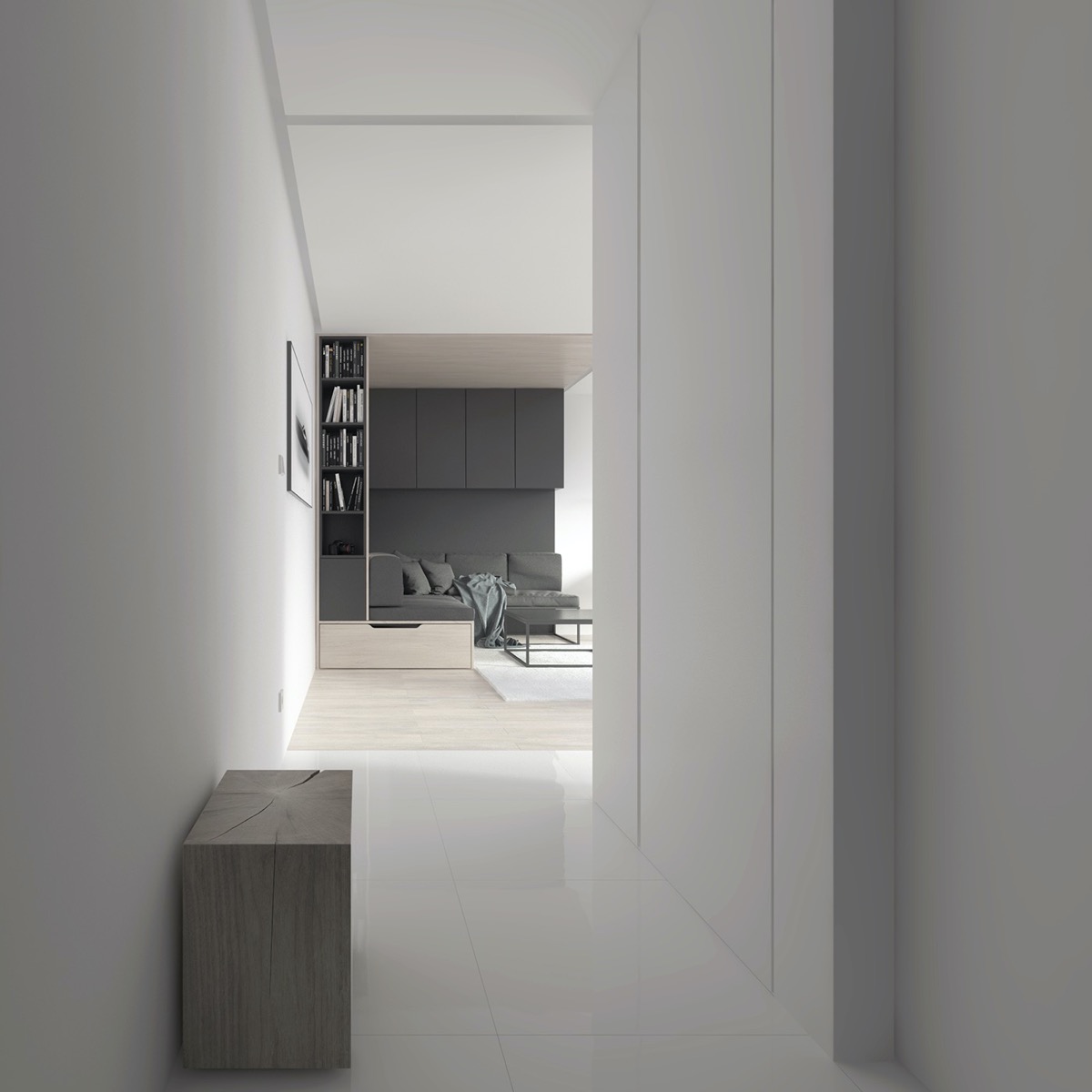 The marble side table is paired with a projected saddle chair, to make an elegant reading area next to another bespoke bookcase design. On this side of the room, the bookshelves are cut from solid white marble and placed within the boundaries of a smooth, soothing tone of the wood. Recessed lighting gently highlights the narrow tower.