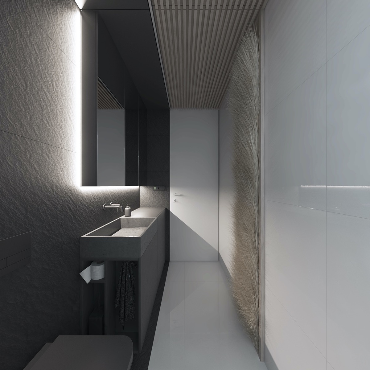 Upon entering the apartment, we escape from city life behind a screen of tall tropical plants that filter out sunlight and spy eyes. The “casual” living room behind the ground floor is an elegant arrangement of project furniture with raised yellow and blue accents. A unique glass coffee table is raised by a striking rug. A chic store completes an Eames-style armchair.