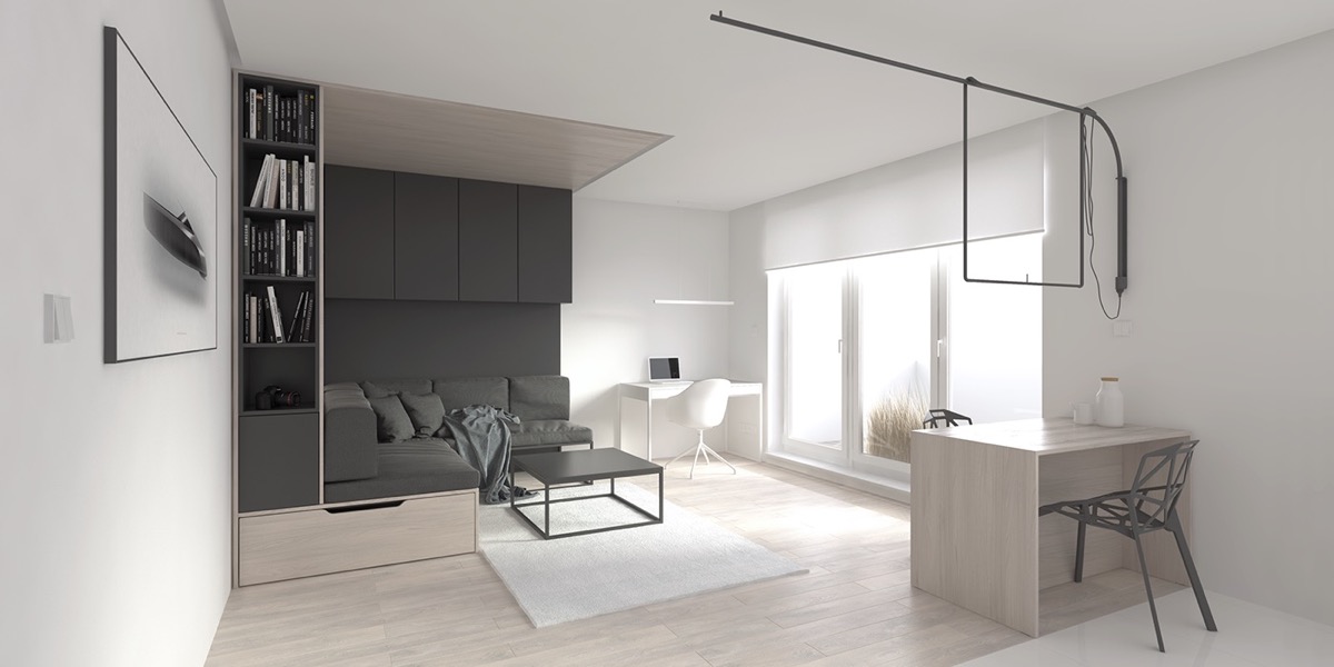 Living comfortably in a space of less than 30 square meters requires some creative thinking, and this pair of studio designs have space-saving ideas that are sure to inspire. Each of these two unique small home interiors includes playroom tailored furniture that allows you to use the floor layout completely new. Home design number one has a tailored cube of the living room and bedroom furniture in one – no conventional sofa bed visible – and storage space is plentiful but unseen. Our second home design brings many closets in which an entire bathroom is hidden, and built-in bookshelf ears in a multi-level bedroom with a unique home workshop.