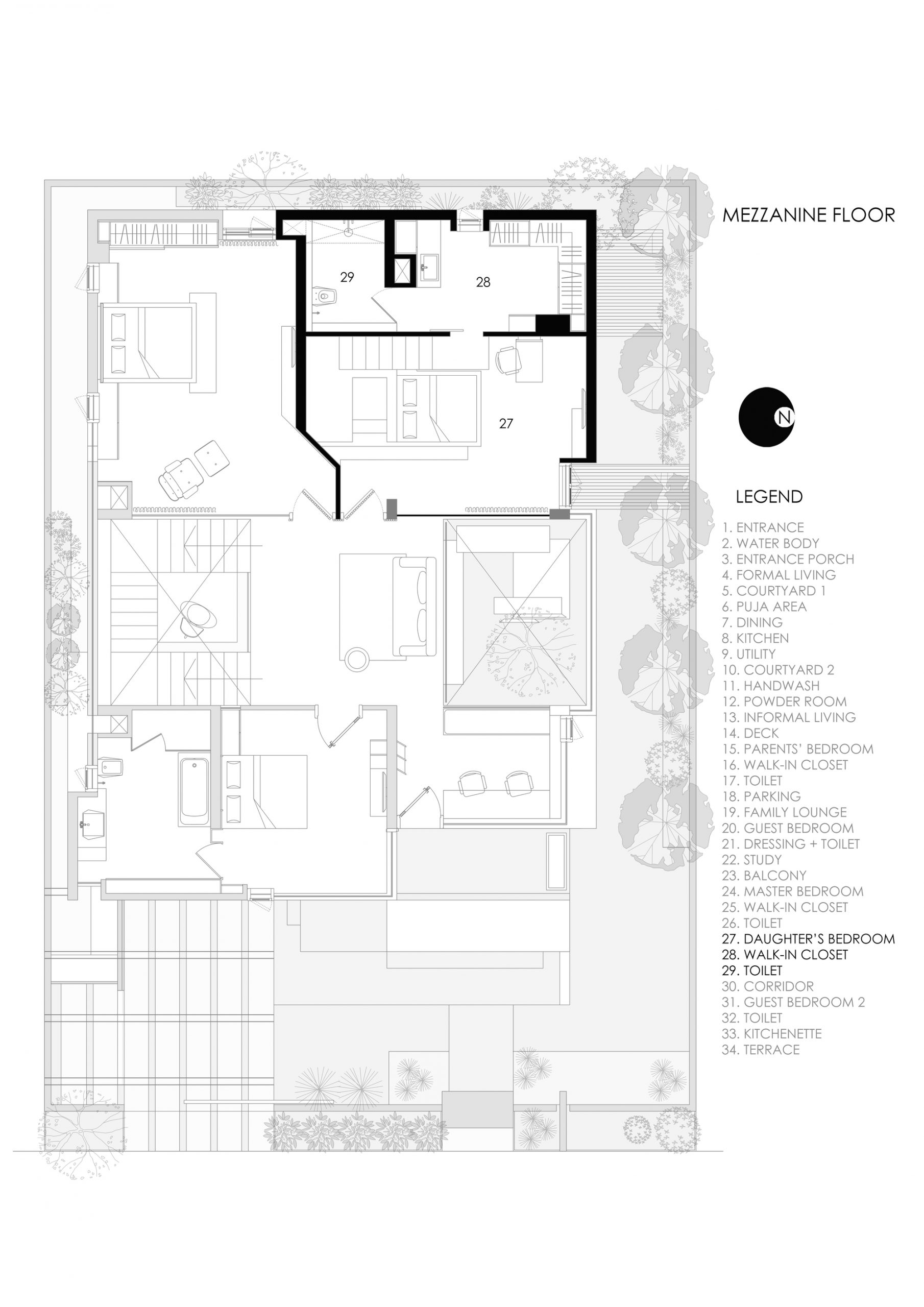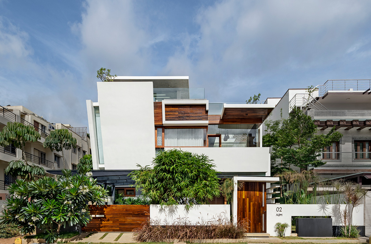 Abstract, linear volumes pile up to form a distinct modern 4266 square foot home for five families in Bangalore, India. Created by Spine Architects, the unique angular shape stands out sharply against a gray, densely populated metropolis. Pure white concrete and rich wooden cladding contain a dwelling based on the ancient architectural science of Vaastu, which embraces the advantages of nature. The interior spaces are simple, spacious and projected around two landscaped courtyards, each with skylights that flood sunlight into the openly interconnected floors of the house. The natural greenery brings a valuable exterior within the introverted urban housing, with trees that draw the eye up through the impressive void.