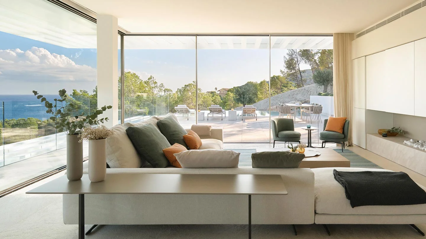 The recent interior design for Villa Statera, created by Terraza Balear, is a pure concept of linearity to complete the architecture of the home. The decoration is done in a natural palette that blends in with the surrounding surroundings of the coastal residence and includes high-quality brands such as B&B Italia, and a Poliform design kitchen.