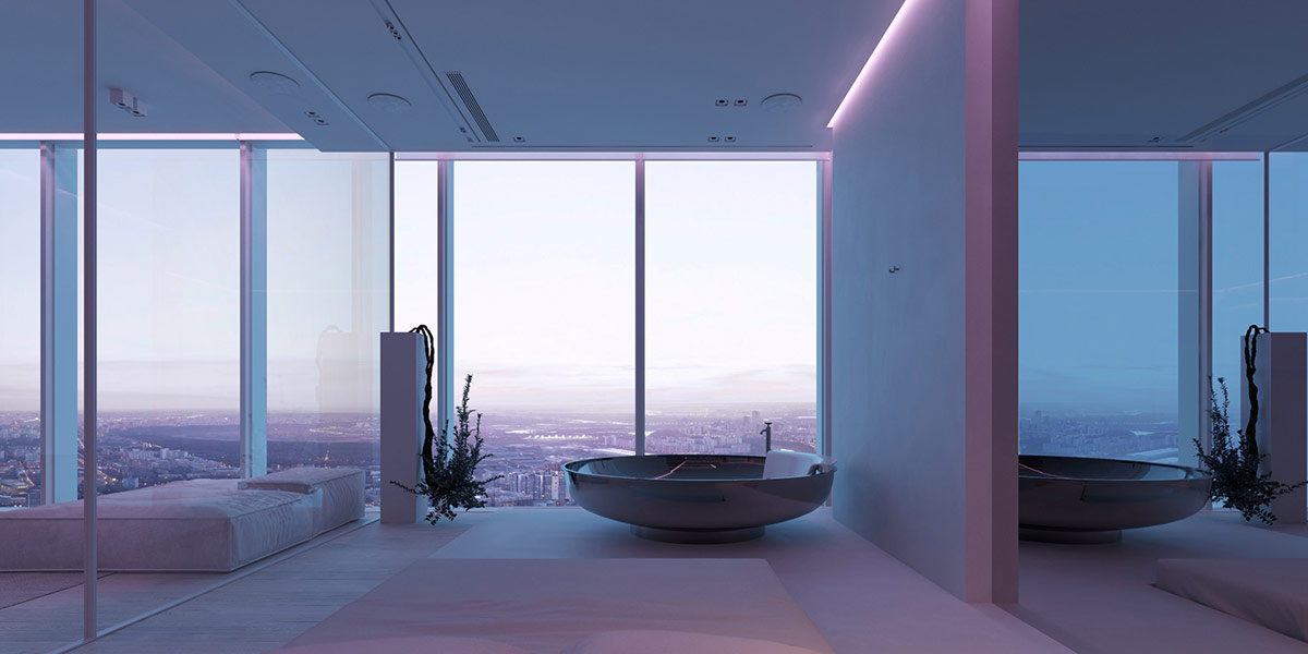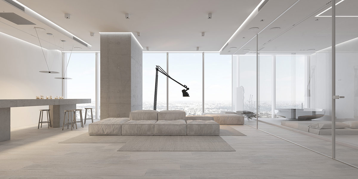 Laconic yet luxurious, this minimalist home design features high-quality twists on a wide-open space. Displayed by Igor Sirotov, The urban attic features huge modern furniture that gives great statements within a relaxed layout. Colorful atmospheric light transforms the simple white decor in an instant, without complicating or cluttering the space. Raw concrete elements add an industrial element to the modern attic interior, to compensate for the purity of color and line. The bedroom and its free-standing bathroom are located in an extravagant glass envelope volume that lets the cityscape flow uninterruptedly. Only the toilet and butler’s pantry are hidden from plain sight, resulting in one spectacular multifunctional life experience.
