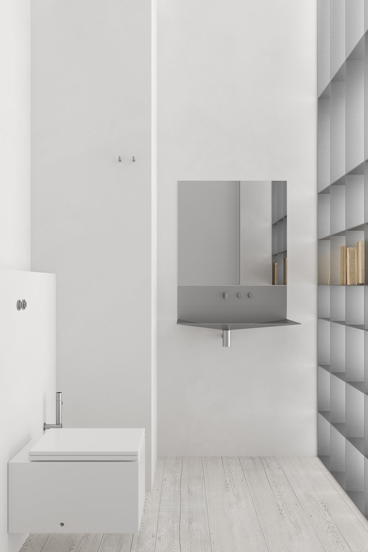 The Monolith project is a 105-square-meter apartment located in Lviv, Ukraine. Slender wood paneling exaggerates the height of the spacious living room. Set of Formakami hangers by Jaime Hayón for & Tradition use the high ceiling.