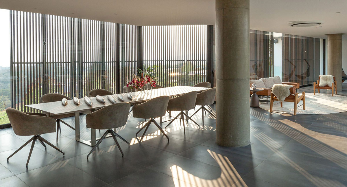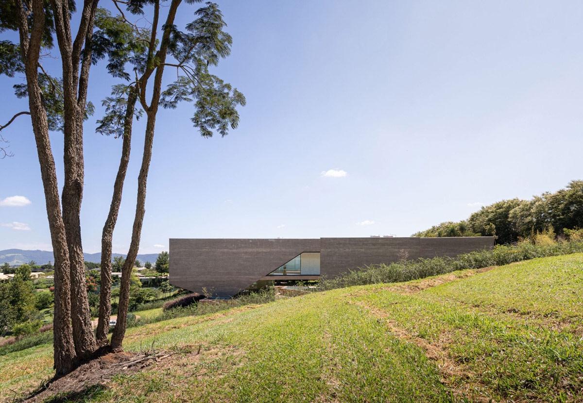 Resting gently on the undulating green ground of Bragança Paulista in the state of São Paulo, Brazil, this luxurious home design respects its place. Created by an architectural firm Jurij Vital, the 693-square-foot house was designed as a perfectly linear volume that draws in both intimate and distant views of the beautiful valley ahead. A board-shaped concrete exterior shapes the modern home exterior, along with huge expanses of wooden shutters. Cantilevered volumes float lightly between oblique structural walls on each side of the house. Elegant supporting pillars meet the grassy ground or sink gently into the water mirror that surrounds the front of the farm.
