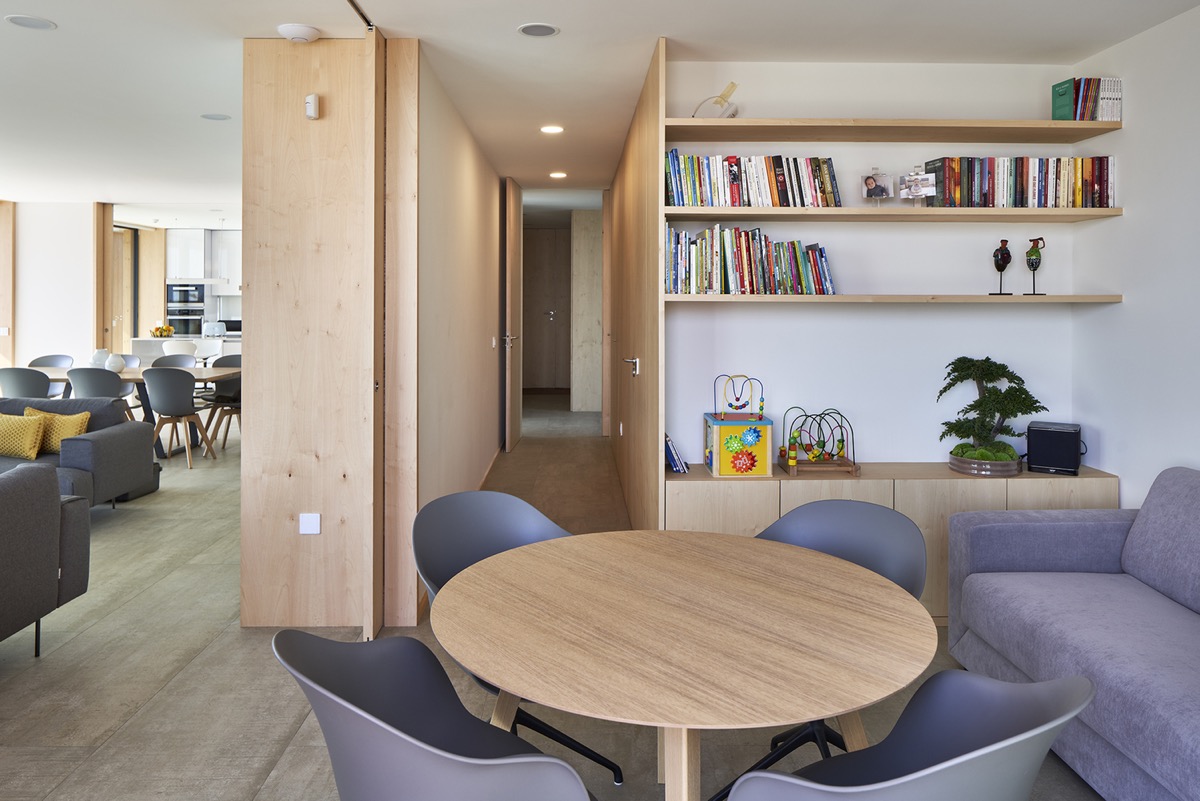 Measuring 115 square meters (1245 square feet), this apartment interior is located in a tall building that faces the Tamsui River in Zhuwei District of New Taipei City. Rainy days at the end of winter previously evoked a sad atmosphere in this place, but now every day is overshadowed by the light of a false skylight that extends over the study area and the walkway that leads to the kitchen.