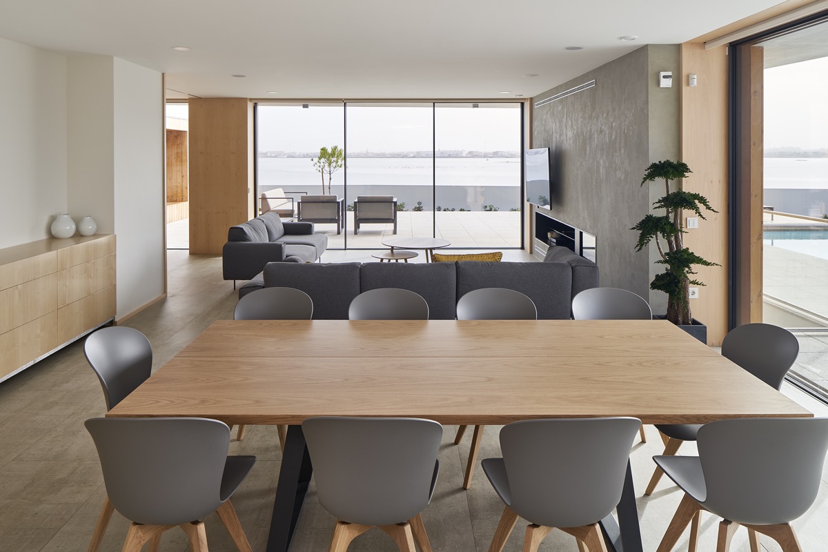 Displayed by Ivan Petechel and Kut Victor, our second curved home design is a bright and welcoming space. A curved sofa surrounds a round rectangular coffee table in the living room, while a running dining table curves the furniture behind.
