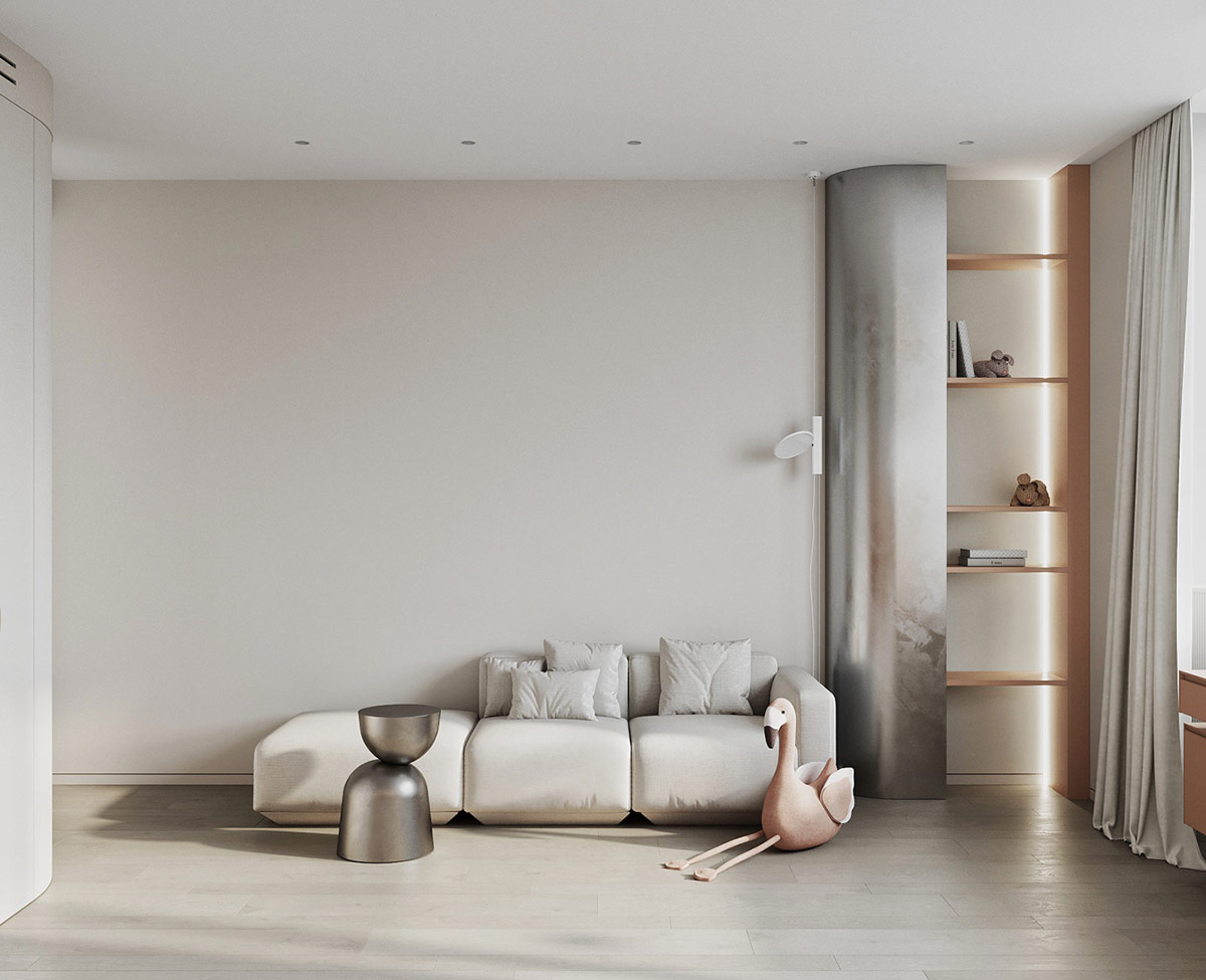 Each of these apartment interiors was designed by 23Design to form a sense of solar serenity in the modern world. With a gray and white decorative palette, elegant contemporary furniture silhouettes and a minimalist approach, these two light-filled apartment projects reassure sanctuaries you can find after a day in the bustling city. The first interior we will visit has a false roof design that creates an open and sunny feel, even on a gray day. Properly built warehouses line the walls and contain a hidden doorway. The second serene gray and white interior has a solar boost with light yellow accents, and a glass wall home office that shares the distribution of natural light.