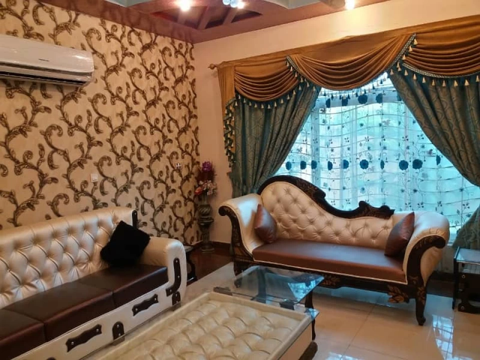 5 bedroom attached bathroom double kitchen Tiles Marble flooring proper wood works good condition newly painted solid construction gas and electricity connected more information contact