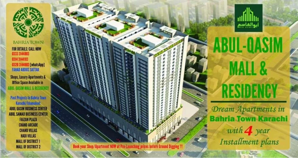 Last Chance: Almost Sold Out! Affordable Shops, Apartments & Food Court In Karachi.Excellent opportunities to invest in the heart of Bahria Town.Best Location: Just 200m From Bahria Town Main Gate!ABUL QASIM MALL & RESIDENCY First-Ever Mall Of Bahria Town Karachi Apartments 1100 Sq ft & 1750 Sq ft Available 2 BED: JUST PAY 21 LACS!3 BED: JUST PAY 34 LACS!Shops Also Available: Shops Suitable For Restaurants, Cafe, Foodcourt, etc..