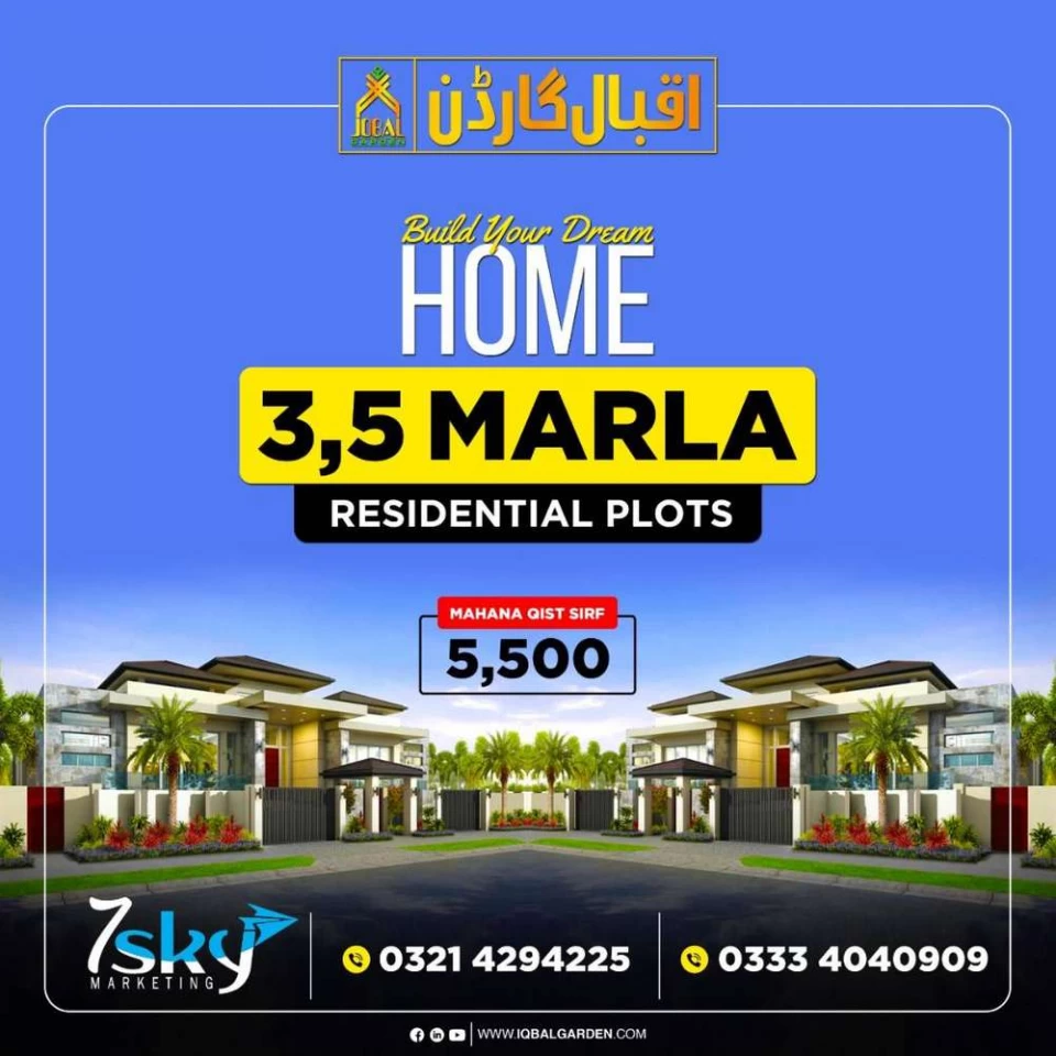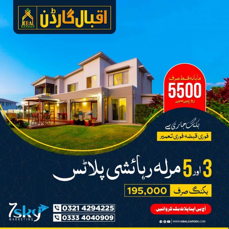 Iqbal Garden Located Near Kala Shah KaakooEasy ApproachesGood LocationEasy Payment Plan Of 3 YearsReasonable Advance And Reasonable Price Of 3 Marla And 5 Marla Plots.3 Marla Rs 795,000/-Down Payment 195,000/-Monthly 5500/-5 Marla Rs 12,50,000/-Down Payment 295,000/-Monthly 8,500/-36 Easy InstallmentsPossession Available.All Facilities AvailableGood Development WorkFor More Details Or Visit Soceity Please ContactSyed Faheem Abbas Gillani