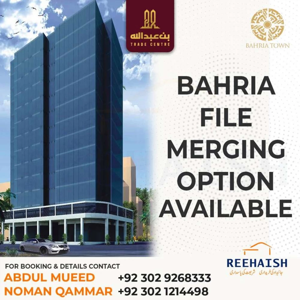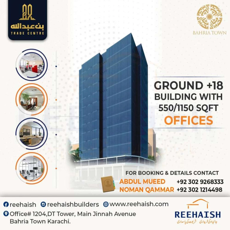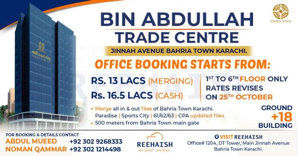 Bin Abdullah Trade Centre Offices are available on the 1st to 6th floor with merging facility & Rates will be revised on 25th Oct 20.SOLD - Only a few offices left. Book your office now before the offer runs out! BIN ABDULLAH TRADE CENTER!Booking starts from Rs. 13,00,000 (merging) &Rs;. 16,50,000 (cash) .500 meters from Bahria Town Karachi main gateMerge all in & out files of Bahria town Karachi. Ground +18 building. Location:Reehaish Builders Private Limited: Office # 1204, 12th Floor, DT Tower, Plot # B5 Main Jinnah Avenue Bahria Town Karachi.Google Maps: shorturl.at/fghjx #propertybrothers #propertymanagement #propertyforsale #PropertyInvestment #propertystyling #propertydevelopment #propertymanager #propertyagent #AQ#AbulQasim#AQRealestateandbuilders#officeoninstalment#officebuilding#merging#Adjustmentfiles#sportscity#paradise #propertydeveloper #propertymanagers #propertyfinder #Bahriatown #Bahriatownkarachi #BTK #BTPL #Reehaish #Reehaishbuildersprivatelimited#Reehaishbuilders #binabdullah #offices #limitedtimeoffer