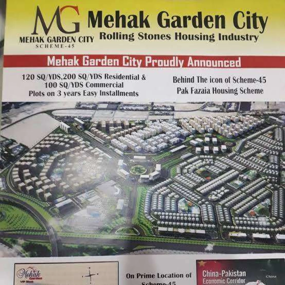 I am selling my plot in Mehak garden City society, Scheme 45, SBCA and MDA approved reliable project, Double side Corner Plot , main 40' feet wide road front facing, 120 SQ/feet , Need money that's why IAM selling,,Plot instalment pa ha. 2.3 years ki complete hogai ha instalment, just 9 month ki baki ha, Monthly 6000 or qabza pa 1.5 lac dany ha.File complete ha first owner ha, all instalment slips file ma attached ha.